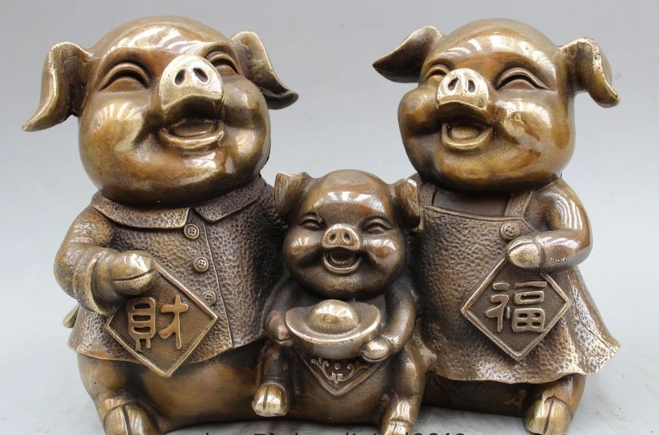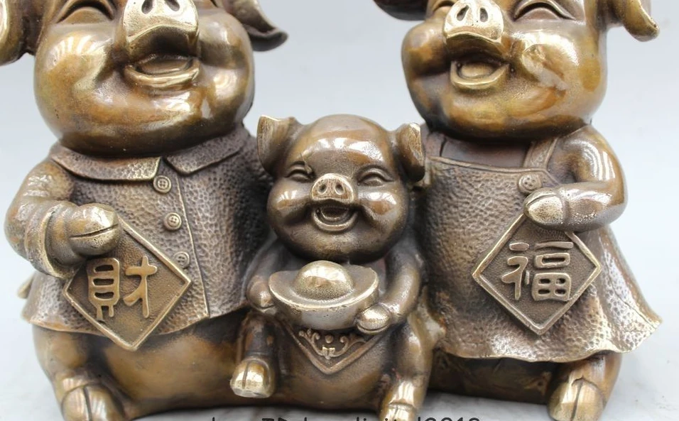 9" China Folk Fengshui Brass Wealth Cute Zodiac Year Pig Family Yuan Bao Statue